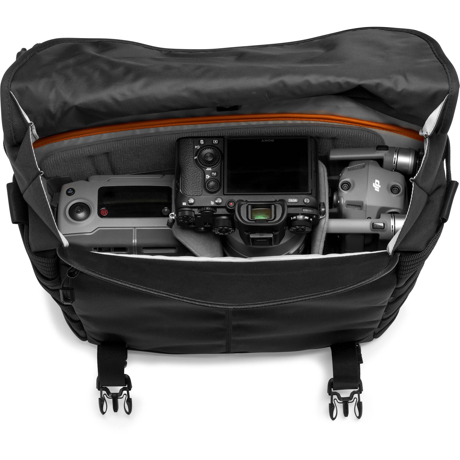 High-performance modular camera messenger designed for DSLR or Pro Mirrorless cameras with customizable storage split of camera gear to personal belongings.